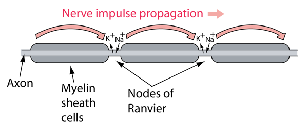 The myelin sheath around the axon prevents the gates on that part of the axon from opening and exchanging their ions with the outside environment. There are gaps between the myelin sheath cells known as the Nodes of Ranvier. At those uncovered areas of the axon membrane, the ion exchange necessary for the production of an action potential can take place. The action potential at one node is sufficient to excite a response at the next node, so the nerve signal can propagate faster by these discrete jumps than by the continuous propagation of depolarization/repolarization along the membrane. This enhanced signal transmission is called saltatory conduction (from the Latin saltare, to jump or hop).