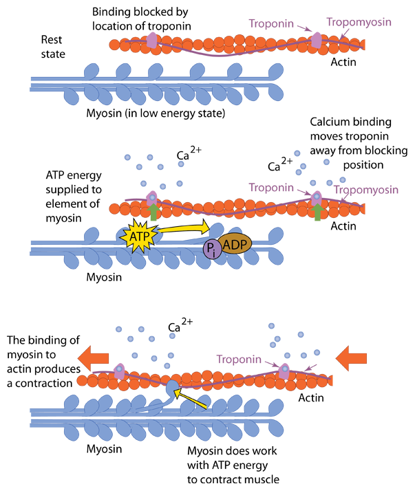 In order to bind to the actin, the myocin must have a supply of energy, which it obtains from ATP . Having absorbed energy from ATP, a unit of the myosin fiber will be in a stressed or high energy state, like a stretched spring. With the action of the calcium to withdraw the troponin and tropomyosin, the myosin structure can bind and use the energy to pull the actin fiber, shortening or contracting the muscle fiber.