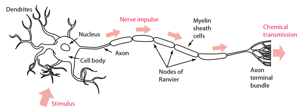 A nerve cell is like a receiver, transmitter and transmission line with the task of passing a signal along from its dendrites to the axon terminal bundle.