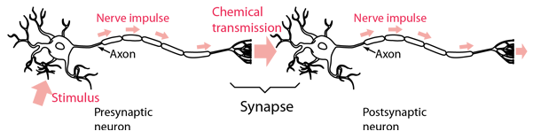 The nerve cells which are used for the perception of external events will, upon being excited by the proper stimulus, transmit an action potential down their axons. When the electrical signal reaches the axon terminal bundle, it interacts with structures called synaptic knobs. It stimulates an influx of calcium (Ca2+) through voltage-gated Ca2+ gates. This causes the movement of vescicles toward the membranes of the synaptic knobs. Inside these vesicles are neurotransmitter chemicals. The neurotransmitters are manufactured in the cell body and travel down the axon to be stored in vesicles associated with the synaptic knobs. When a vesicle reaches the cell membrane of the synaptic knob, it fuses with the cell membrane and releases its neurotransmitter into the synaptic region. On the postsynaptic neuron are receptors that will specifically bind these neurotransmitters. The neurotransmitter will either excite or inhibit the firing of the postsynaptic neuron.