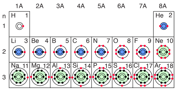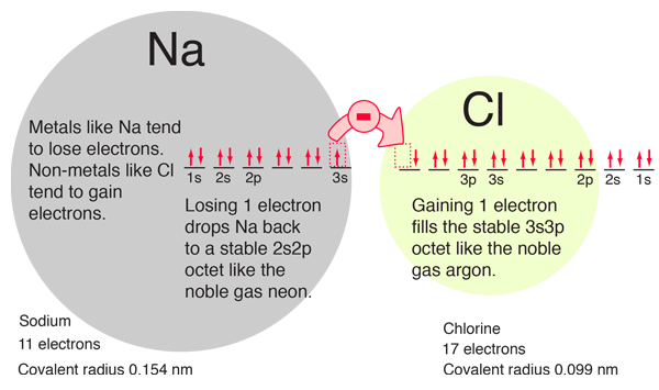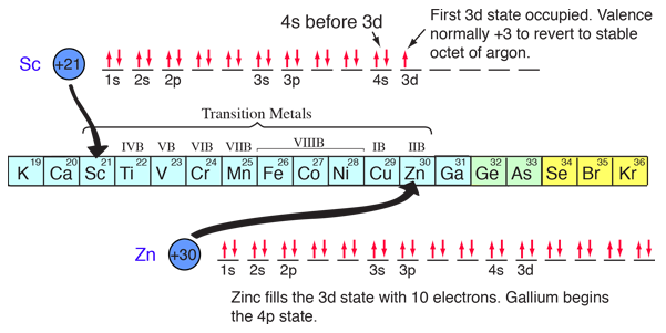 The filling of the 2p orbital places eight electrons in the second shell, a "stable octet". The particularly stable configuration produces the noble gas neon. But fluorine with one less than a stable octet is very active! It tends to gain one electron while the very active sodium tends to lose one electron, in each case producing the stable octet configuration of neon. The electron orbital configurations provide a structure for understanding chemical reactions, which are guided by the principle of finding the lowest energy (most stable) configuration of electrons. We say that sodium has a valence of +1 since it tends to lose one electron, and chlorine has a valence of -1 since it has a tendency to gain one electron. Both of these atoms are very active chemically, and their combination is the classic case of an ionic bond.  The chemical compounds involving elements in the first three rows of the periodic table can be well understood with the kind of orbital considerations above. Things become more complicated in the fourth row of the periodic table. The 4s electrons dip down below the 3d electrons in energy, and since there are ten possible quantum number combinations in the d sub-shell, this inserts 10 elements between the 4s and 4p subshells, the so-called "transition elements".