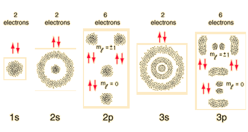 | Visualizing Electron OrbitalsRough sketches of the electron density for the first three shells of the hydrogen atom can give an impression of the constraints that govern the buildup of the periodic table. The limits on the occupation of the subshells arise from the quantum numbers for the atomic electrons and their relationship to each other. These sketches arise from the hydrogen wavefunctions which map the electron density.  The numbers of the main shells, like 1s, arise from the principal quantum number n in the quantum mechanical description of the electrons. The letters designate the sub-shells and follow the historical spectroscopic notation. In general terms, the higher shells have higher energy (less tightly bound) and are on the average further out from the nucleus. This is strictly true for the hydrogen atom where the energy levels depend only upon the principal quantum number (fine structure neglected). But in larger atoms, the energy depends also upon the orbital quantum number so the sub-levels are filled in the order s, p, d, f, etc. This spreading eventually leads to overlap, with the 4s sub-level being lower in energy than the 3d sub-level. The division into main shells encourages a kind of "planetary model" for the electrons, and while this is not at all accurate as a description of the electrons, it has a certain mnemonic value for keeping track of the buildup of heavier elements.  Perhaps a better way to keep track of the buildup process is to just track the filling of the states, emphasizing the order of buildup and the fact that the states are definite, quantized energy states. The Pauli exclusion principle tightly constrains the entire buildup process, allowing only one electron to occupy each available state. Since all of nature tends to the lowest energy state, the individual states will fill in the order of ascending energy.