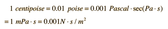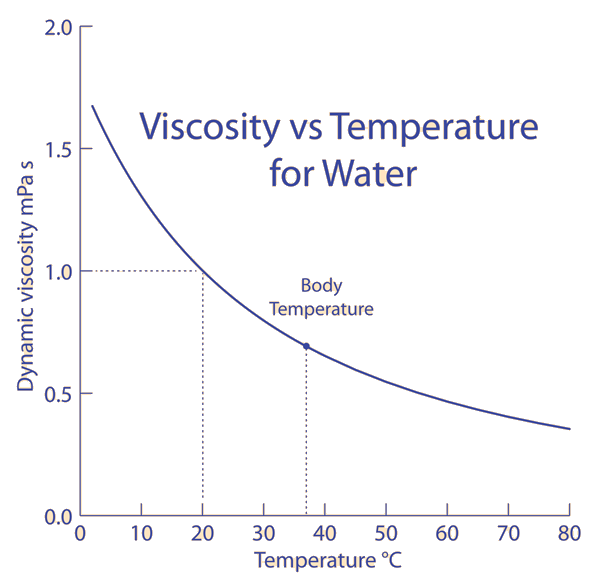| Viscosity of WaterThe viscosity of water measures its resistance to flow and is critical to its many functions. The low viscosity of water is important in its role as the solvent for life's chemical reactions and for blood circulation. The viscosity of water has been studied thoroughly because of the precision with which water flow must be controlled in many industrial applications.  Viscosity of liquids is expressed in a variety of units:  with the standard SI unit being the Pascal second or Poiseuille. That unit does not prove to be convenient for many uses, but note that the viscosity of water at 20°C is almost exactly 1 if expressed in centipoise or milli-Pascal seconds. So like its convenient density of 1 gm/cm3, water at 20°C provides a convenient comparison standard for viscosity. References: