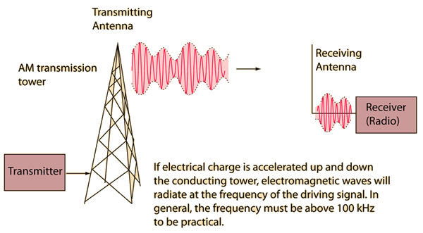 AM Transmission Stage![]() The electrical signal from the AM modulation stage contains the information to be transmitted superimposed on the precisely controlled carrier frequency wave. Neither sound waves themselves nor electrical signals at audio frequencies can be transmitted over large distances. The AM band of frequencies is between 535 KHz and 1605 kHz, corresponding to wavelengths between approximately 200 and 600 meters. These long wavelengths dictate long conducting antennas, so it is customary to see metal towers or antennas on top of mountains or tall buildings. The radio transmitter is a power amplifier which provides enough power to generate radio frequency electric currents in the conducting broadcast antenna. Such antennae for AM radio are vertical, which leads to transmitted electromagnetic waves which are linearly polarized in the vertical direction. The electromagnetic waves, transmitted at the speed of light, are received by metallic antennae on the radio receivers. These antennae must also be oriented vertically for optimum reception. FM radio signals, by contrast, are transmitted with both horizontally and vertically polarized signals, so vertical antennae are not required. |