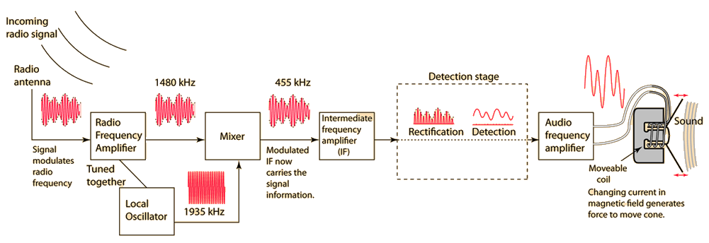 AM Modulation Stage for AM Radio![]() In order to generate the radio frequency signal for AM radio transmission, the information contained in the original sound signal must be put in a form that can be sent to a great distance. When information from a voice is broadcast on an AM radio station, an electrical image of the sound is made by a microphone. A dynamic microphone is an example. That electrical signal or a signal from another recorded source is used to modulate the amplitude of the much higher frequency carrier wave. The electrical image of the sound information is used to vary the amplitude of the carrier wave by an amount porportional to the strength of the original sound signal. The modulated carrier wave is then amplified by the transmitter, which amounts to a power amplifier which can apply the modulated electrical wave to the conducting element in the transmitting broadcast antenna of the radio station. The AM band of the Electromagnetic spectrum is between 535 KHz and 1605 kHz and the carrier waves are separated by 10 kHz. |