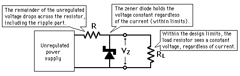 Zener Regulator DesignOne strategy for designing a Zener regulator circuit is to design for a maximum power dissipated in the zener diode when the regulator is open circuited. ![]() The logic of this design strategy is to protect the zener diode. The designed resistor limits the current so that you don't burn out the zener diode if the load resistor gets disconnected. Calculation note: You may substitute values for the zener voltage, the maximum power, the input voltage, or the load resistor. The other parameters will be calculated. Default values will be entered for unspecified parameters used in the calculation. If you experiment with the input values, you will discover some of the practical truths about zener-regulated power supplies. If you start with an unregulated power supply which is closer to, but not less than, the zener voltage, you will be able to get more regulated power out without open-circuit risk to the zener diode. The circuit will also be more efficient in power use.