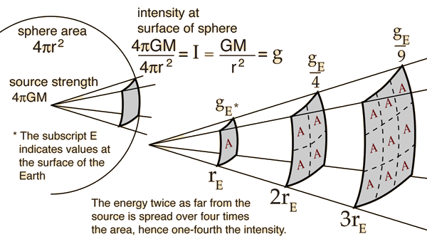 Inverse Square Law, GravityAs one of the fields which obey the general inverse square law, the gravity field can be put in the form shown below, showing that the acceleration of gravity, g, is an expression of the intensity of the gravity field.