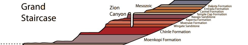 The Grand Canyon and the layered formations north of it to Zion Canyon and Bryce Canyon display the history of sedimentary rock through much of Earth's history. The formations rise in what is often called the "grand staircase". The multiple layers offer an opportunity to survey many types of sedimentary formations. The illustration below will be used as a key to the discussion of the multiple formations. This illustration is patterned after one in "The Grand Canyon", C. Hill, et al., eds, Figure 3-2 and a similar color scheme is followed for organization of the comments.