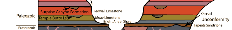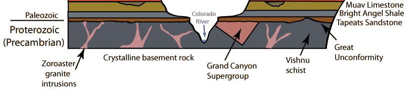 The term "unconformity" is used for a location where two layers of rock are in contact, but there is evidence that material is missing, i.e., the two layers were not formed at the same time. The "Great Unconformity" is perhaps the most famous unconformity. At some locations, the Tapeats Sandstone is in direct contact with the Vishnu Basement Rock where the time gap may be 1200 Myr.