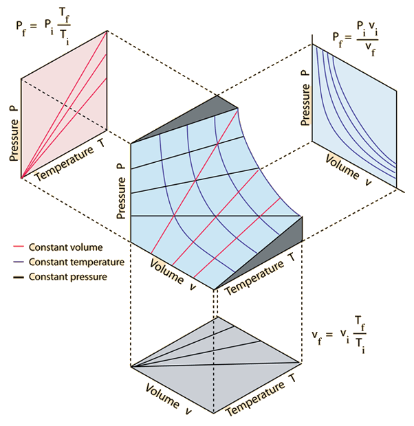 Ideal Gas Law with ConstraintsFor the purpose of calculations, it is convenient to place the ideal gas law in the form: ![]() where the subscripts i and f refer to the initial and final states of some process. If the temperature is constrained to be constant, this becomes: ![]() which is referred to as Boyle's Law. If the pressure is constant, then the ideal gas law takes the form ![]() which has been historically called Charles' Law. It is appropriate for experiments performed in the presence of a constant atmospheric pressure. All the possible states of an ideal gas can be represented by a PvT surface as illustrated below. The behavior when any one of the three state variables is held constant is also shown. ![]() |