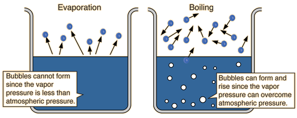 Evaporation vs BoilingOrdinary evaporation is a surface phenomenon - since the vapor pressure is low and since the pressure inside the liquid is equal to atmospheric pressure plus the liquid pressure, bubbles of water vapor cannot form. But at the boiling point, the saturated vapor pressure is equal to atmospheric pressure, bubbles form, and the vaporization becomes a volume phenomenon. ![]() |