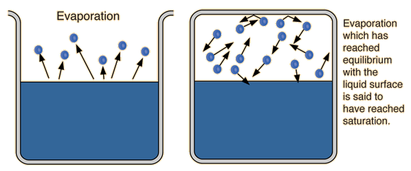 EvaporationOrdinary evaporation is a surface phenomenon - some molecules have enough kinetic energy to escape. If the container is closed, an equilibrium is reached where an equal number of molecules return to the surface. The pressure of this equilibrium is called the saturation vapor pressure. ![]()