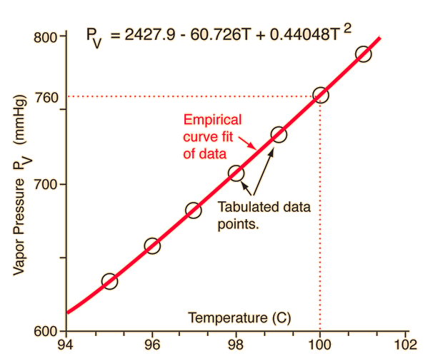 Boiling Point Variation Near 100 C![]() Values were taken from the saturated vapor pressure table for water near 100 degrees Celsius. An empirical fit to these data values was made, and the formula obtained is shown on the diagram. It could be considered to be reasonably valid only for a few degrees above and below 100 °C since the curve is very non-linear.