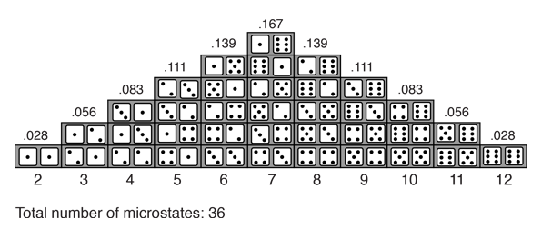 | Statistics of Dice ThrowThe probababilities of different numbers obtained by the throw of two dice offer a good introduction to the ideas of probability. For the throw of a single die, all outcomes are equally probable. But in the throw of two dice, the different possibilities for the total of the two dice are not equally probable because there are more ways to get some numbers than others. There are six ways to get a total of 7, but only one way to get 2, so the "odds" of getting a 7 are six times those for getting "snake eyes". This simple example raises the idea of distinguishable states. For example, throwing a 3 is twice as likely as throwing a 2 because there are two distinguishable ways to get a 3.  The probability of getting a given value for the total on the dice may be calculated by taking the total number of ways that value can be produced and dividing it by the total number of distinguishable outcomes. So the probability of a 7 on the dice is 1/6 because it can be produced in 6 ways out of a total of 36 possible outcomes.