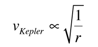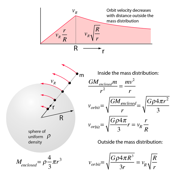 | Orbit Speed Inside and Outside a Mass DistributionThe orbit speed of an object is a measure of the amount and distribution of the mass that is attracting it gravitationally. To examine this dependence, consider a sphere of uniform density ρ which is diffuse enough to permit the orbiting of a mass m within the radius of the mass distribution. For this idealized case, the inverse square law form of the law of gravity along with the centripetal force relationship can be used to calculate the orbit velocity for a circular orbit. This calculation is made possible by the fact that the orbiting mass experiences a net attraction only by that mass inside its orbit, and the mass outside its orbit exerts a net zero force.  Upon calculating the circular orbit velocity, we find that inside the spherical mass distribution, the orbit velocity increases with radius, reaching a maximum at the radius of the mass distribution. Then if falls off as the radius increases, following the relationship:  This calculation was done for a spherical mass, but for a uniform disc of mass like an idealized galaxy, the orbital velocity of material outside the detectable mass of the galaxy would be expected to fall off as some factor times the inverse square root of the radius. Surprisingly, the orbital velocity does not fall off at the edge of the detectable matter, staying almost constant well beyond the detectable edge of the galaxy. This is the nature of the evidence for dark matter which exceeds the visible matter by about a factor of six.