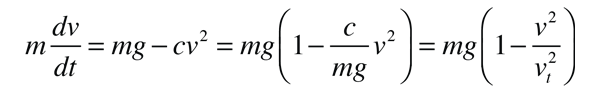 A freely falling object will be presumed to experience an air resistance force proportional to the square of its speed. The downward direction will be taken as positive, and the velocity as a function of time is the object of the calculation. The expressions will be developed for the two forms of air drag which will be used for trajectories: