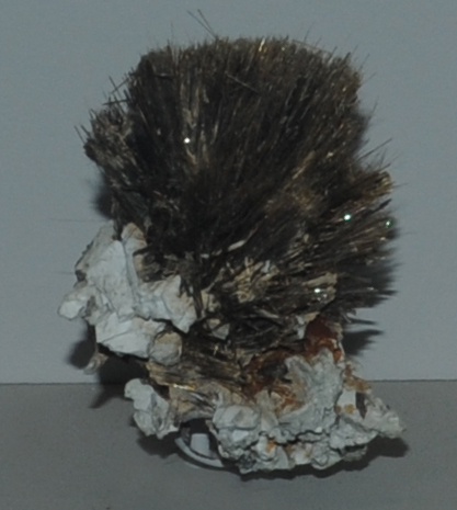 This sample of astrophyllite is displayed in the Smithsonian Museum of Natural History. Astrophyllite contains titanium and manganese. It has the composition (K,Na)3(Fe,Mn)7Ti2Si8(O,OH)31. It is about 6x8 cm across and is from Mont Saint-Hilaire, Quebec, Canada.