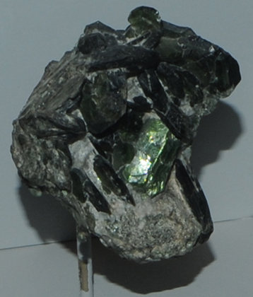 |   | Ca(Mg,Al)3(Al,Si)4O10(OH,F)2These samples of clintonite are displayed in the Smithsonian Museum of Natural History. Clintonite contains five of the big 8 elements plus fluorine  with the composition Ca(Mg,Al)3(Al,Si)4O10(OH,F)2.  The sample at left is about 7 cm across and is from Nicolai-Maximilianovsk mine, Achmatowsk, Zlatoust, Urals, Russia.   |