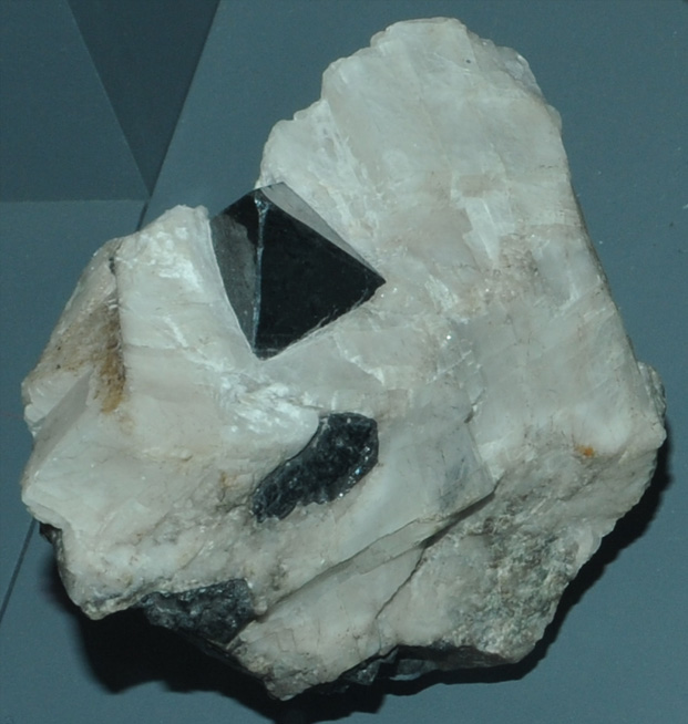 This sample of franklinite is displayed in the Smithsonian Museum of Natural History. Franklinite is a oxide mineral of zinc, manganese and iron with the composition (Zn,Mn,Fe)(Fe,Mn)2O4. The sample at left is franklinite with calcite. It is about 8 cm across and is from Franklin, New Jersey. The mineral and the town are named after Benjamin Franklin.