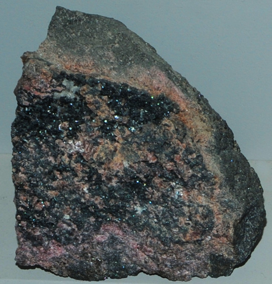 This sample of langbanite is displayed in the Smithsonian Museum of Natural History. Langbanite is a silicate mineral of antimony and manganese along with calcium and iron. It has the composition (Mn,Ca)5(Mn,Fe,Sb)2SiO11. The sample at left is about 8 cm across and is from Langban mine, Filipstad, Varmland, Sweden. The black crystals are langbanite.