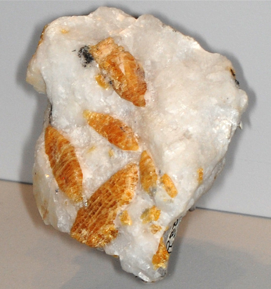 This sample of Norbergite is displayed in the Smithsonian Museum of Natural History. Norbergite is an silicate mineral of magnesium which contains fluorine. It has the composition Mg3(SiO4)(F,OH)2. This sample is about 5x5 cm wide and is from Sussex County, New Jersey.