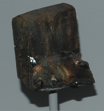 This sample of aeschynite is displayed in the Smithsonian Museum of Natural History. Aeschynite contains yttrium, thorium, titanium, and niobium along with iron and calcium. It has the composition (Y,Ca,Fe,Th)(Ti,Nb)2(O,OH)6. This sample is about 3x4.5 cm and it is from Ivelanc, Setesdal, Norway .