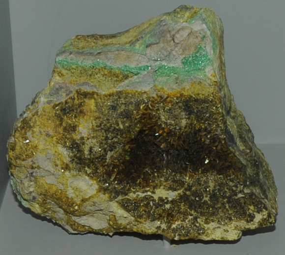 |   | This sample of Becquerelite is displayed in the Smithsonian Museum of Natural History. Becquerelite is an oxide compound of uranium with the composition Ca(UO2)6O4(OH)6.H2O.  The sample  is about 10x12 cm. It is from Mashamba West mine, Kolwezi, Shaba, D. R. Congo.   |