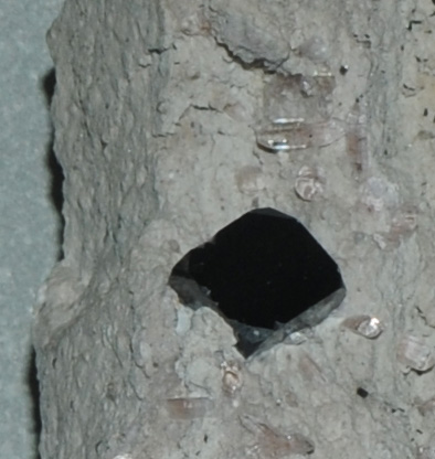 A small topaz crystal can be seen in this section along with the bixbyite crystal.