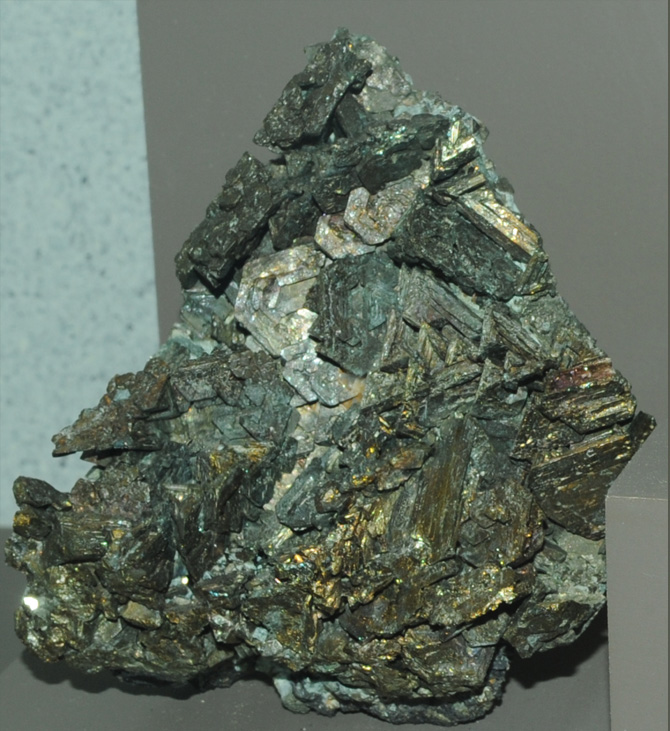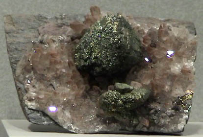 These samples of chalcopyrite are displayed in the Smithsonian Museum of Natural History. Chalcopyrite is a sulfide mineral of copper and iron with the composition CuFeS2. This sample is about 10x7 cm and is from Moonta mine, South Australia. It is formed with quartz.