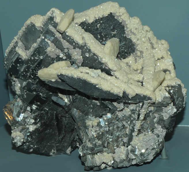 | This is ferberite with arsenopyrite and siderite. The black, shiny crystals are ferberite, an ore of tungsten. The silvery crystals are arsenopyrite, an ore of arsenic. Siderite crystals form the frosting. This sample is about 15 cm across and is from Panasqueira, Portugal.