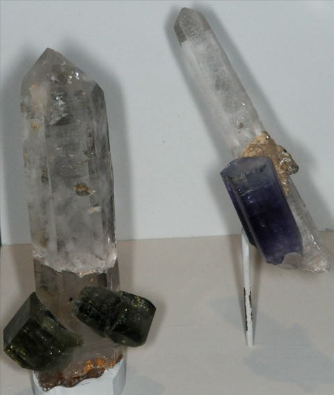 The sample at left is fluorapatite with beryl and muscovite. It is about 15 cm across and is from Dassu, Northern Areas, Pakistan.