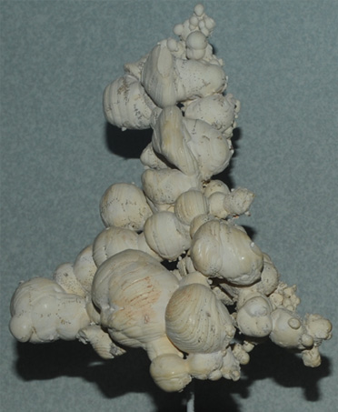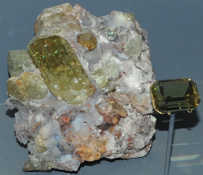 Fluorapatite (Ca5(PO4)3F) is a fluorinated calcium phospate. These samples are on display in the Smithsonian Museum of Natural History. This sample is about 7 cm across and the gem is 51.4 carats. They are from Durango, Mexico. Calcium phosphate in the form hydroxyapatite is the material from which teeth are made, and fluoridation of water is presumed to turn some of that calcium phosphate into fluorapatite. Fluorapatite is considerably harder than hydroxyapatite and is thought to provide a measure of protection against tooth decay.
