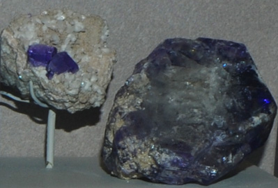 The sample above left is fluroapatite with quartz and cookeite. The sample size is about 3x5 cm, the fluorapatite being the purple crystalline part. The sample above right is about 5x5 cm in size. The description: "This specimen is world-famous among mineral collector for its rare purple color and near-perfect shape. The color comes from impurities of manganese." Both samples are from Pulsifer quarry, Mt. Apatite, Auburn, Maine.
