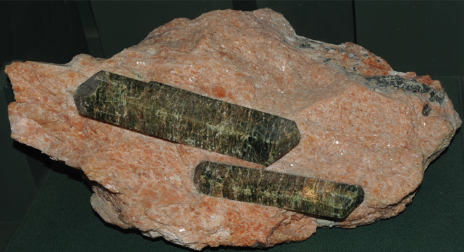 The largest of the fluorapetite crystals at right is about 2.5 x 9 cm.