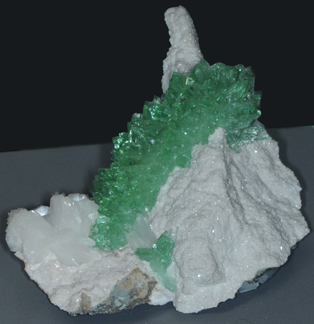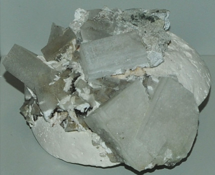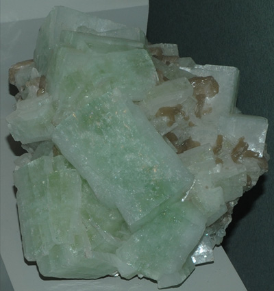 | FluorapophylliteKCa4Si8O20(F,OH).8H2O|   | These samples of fluorapophyllite are displayed in the Smithsonian Museum of Natural History. Fluorapophyllite is a silicate mineral with fluorine and potassium  with the composition KCa4Si8O20(F,OH).8H2O.  The sample at left is fluorapophyllite with stilbite. It is about 12 cm across and is from Khadakvasla, Maharashtra, India .   |
