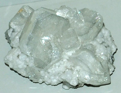 |   |  This is fluorapophyllite with heulandite, calcite and quartz from Paterson, New Jersey. The sample is about 10 cm wide.  The sample at left is fluorapophyllite with stilbite. It is about 12 cm across and is from Rio Grande do Sul, Brazil.  |