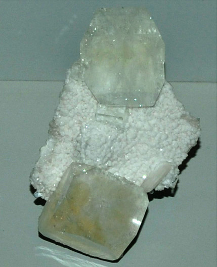 |   This is fluorapophyllite with analcime and calcite. It is about 6 cm across and is from Bergen Hill, New  Jersey.  |  This is fluorapophyllite with prehnite after laumontite. The sample is about 8 cm wide and is from Poona, Maharashtra, India.  |