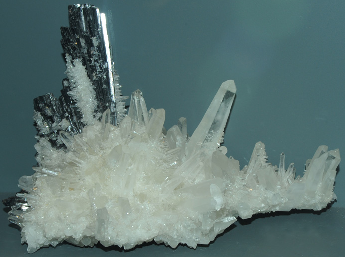 |   | MnWO4These samples of hubnerite are displayed in the Smithsonian Museum of Natural History. Hubnerite is a oxide mineral of tungsten and  manganesewith the composition MnWO4.  The sample at left is about 25 cm across and is from Huallopon mine, Pasto Bueno, Ancash, Peru. A forest of quartz crystals surround the shiny, gray hubnerite.   |