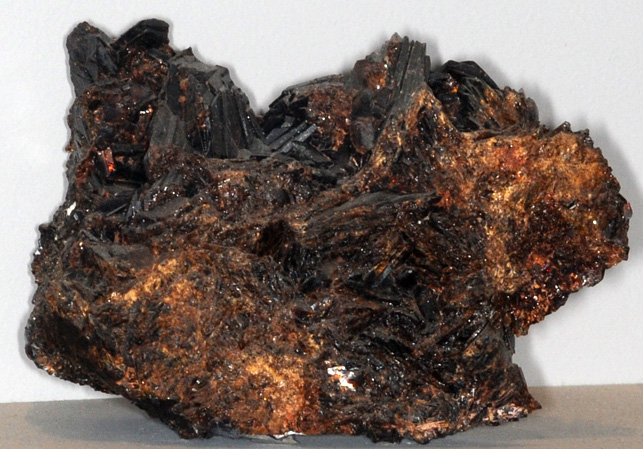 This sample of jarosite is displayed in the Smithsonian Museum of Natural History. Jarosite is a sulfate mineral of iron and potassium with the composition KFe3(SO4)2(OH)6. The sample at left is about 8 cm across and is from Santa Eulalia, Chihuahua, Mexico.