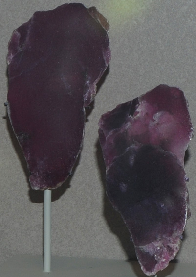 |   This sample is from Brown Derby pegmatite, Gunnison County, Colorado. Each piece is about 10 cm wide. They show the purple color from manganese content.