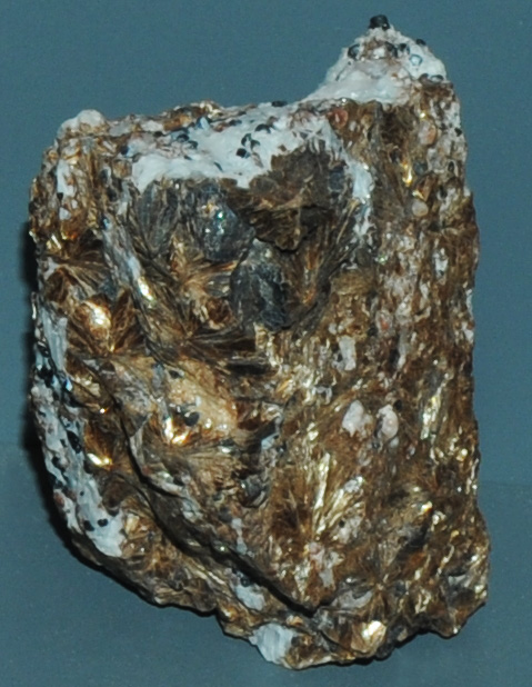 |   | This sample of mcgovernite is displayed in the Smithsonian Museum of Natural History. Mcgovernite is a silicate mineral of magnesium, manganese, zinc and arsenic.   It has the composition Mg4Mn9Zn2As2Si2O17(OH)14.  The sample at left is about 10 cm across and is from Sterling Hill mine, Ogdenburg, New Jersey. It is described as mcgovernite with franklinite and willemite. The mcgovernite is bronze to brown in color, showing in the patterns on this sample.   |