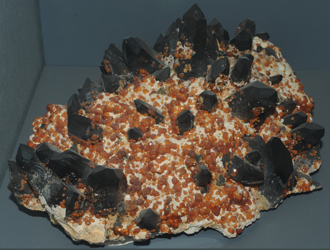 This sample is described as spessartine with helvite, quartz, and microcline. It is about 20 cm long and is from Tongbei, Fujian Province, China. The black crystals are taken to be microcline, the orange spessartine, and the tan helvite. The black crystals show the crystal form of microcline, but the black color is unusual. It is confusing, since there is a black sample of spessartine on display as well, and a white sample of microcline with aquamarine.