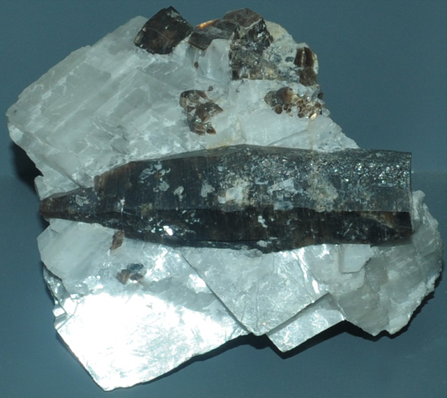 |   | This sample of phlogopite is displayed in the Smithsonian Museum of Natural History. Phlogopite is a silicate mineral with fluorine  with the composition KMg3(Si3Al)O10(F,OH)2.  The sample at left is about 12 cm across and is from Franklin, New Jersey. It is described as phlogopite with calcite.    |