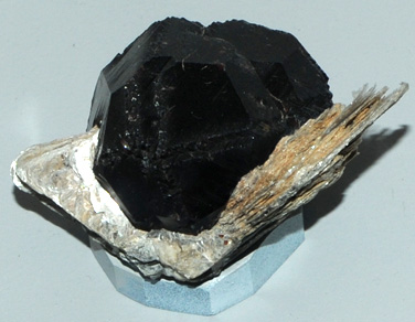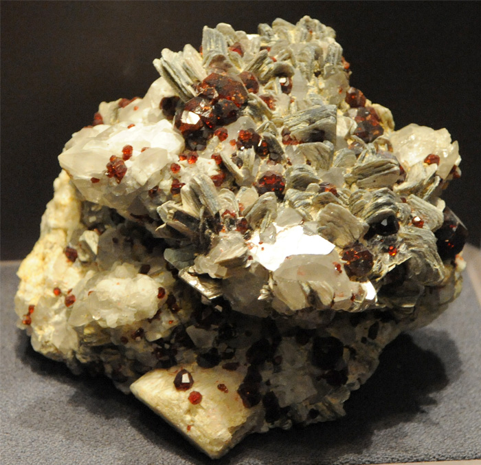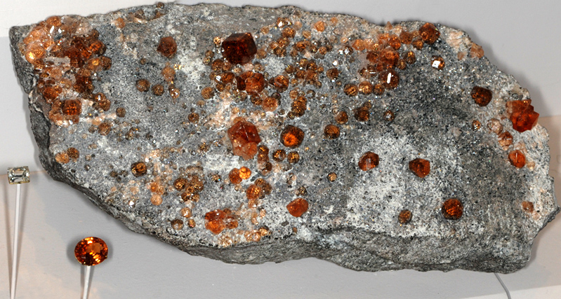 This sample of spessartine with muscovite is about 3x3 cm and is from Gilgit, Northern Areas, Pakistan. These samples are displayed in the Smithsonian Museum of Natural History.