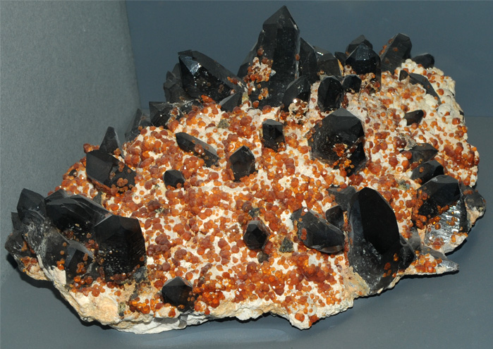 The sample at right is described as spessartine with schorl, albite and quartz. It is about 12x15 cm and is from Hercules mine, Ramona, California.This locality is known for gem-quality orange spessartine, a garnet mineral rich in manganese. The black schorl shows up in dramatic contrast.
