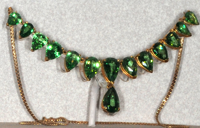 | This necklace exhibits grossular of the variety tsavorite. It is 30.8 carats in total weight and is from Kenya/Tanzania.