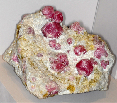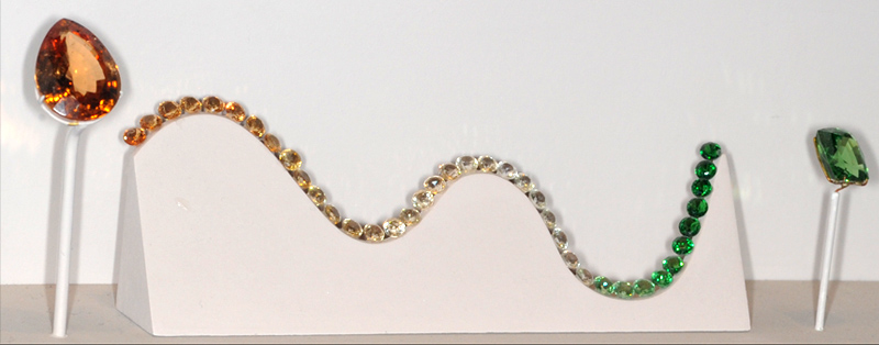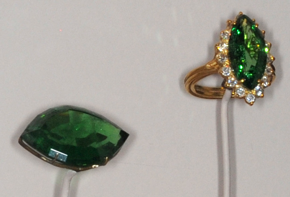This display at the Smithsonian Museum of Natural History shows a range of colors that can be obtained with grossular gems. The large gem on the left is 30 carats and is from Ratnapura, Sri Lanka. The 9.9 carat gem on the right is from Kenya/Tanzania. The smaller gems total 16.86 carats and are from Kenya/Tanzania.