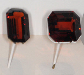 The spessartine gems at right are 18.9 and 27.4 carats and are from Kenya.
