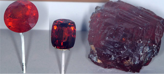 Spessartine is silicate of manganese and aluminum with the composition Mn3Al2(SiO4)3. The samples at left show the dramatic red-orange color it often exhibits.