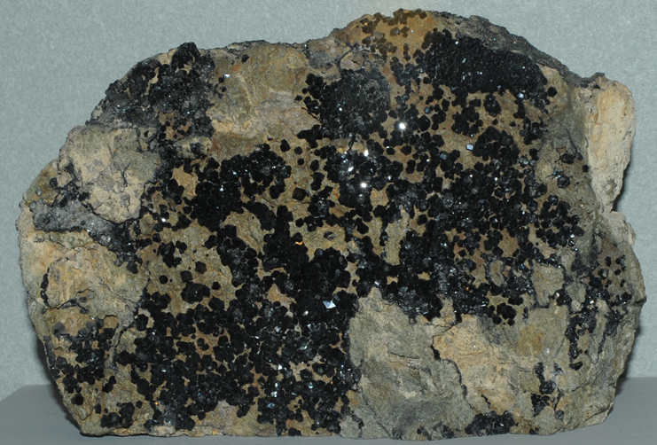 Andradite is silicate of calcium and iron with the composition Ca3Fe2(SiO4)3. This sample is about 10x7 cm and is from San Benito County, California.